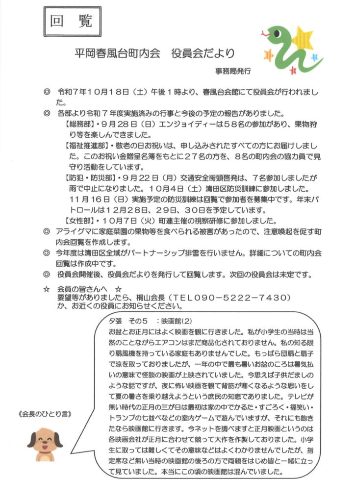 平岡春風台町内会 役員会だより 2025年10月号