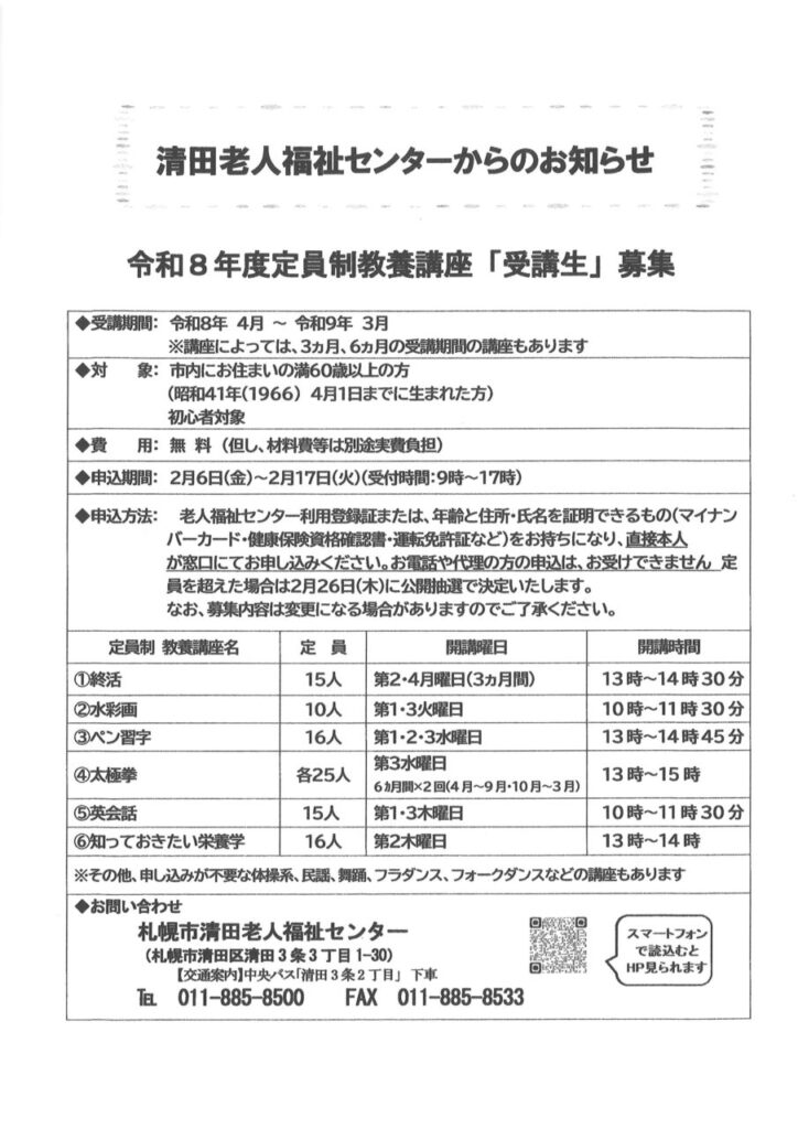 清田老人福祉センターからのお知らせ